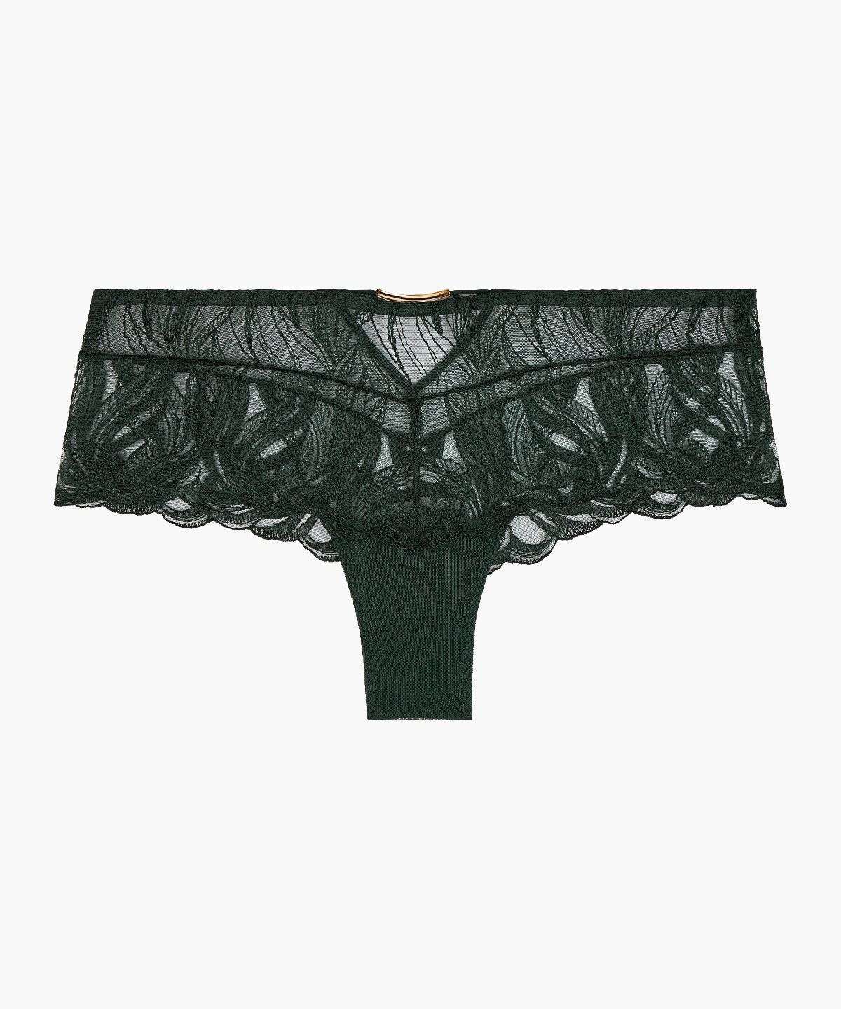 Tout en transparence, le shorty Into The Groove offre une silhouette résolument moderne. Confortable et flatteur, il pare les hanches d’une broderie exclusive, rehausse le galbe des fesses dans une coupe légèrement échancrée et souligne le creux des reins d’une forme en V, sublimée par un détail doré élégant.