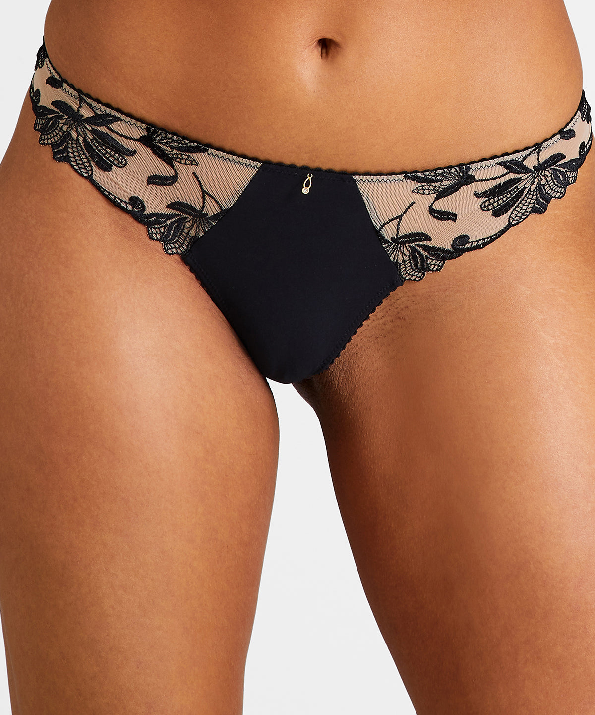 Discret sous les vêtements, le tanga Lovessence n’en est pas moins élégant et sexy. Sa broderie pare les hanches de motifs floraux qui se déploient sur un tulle transparent et autour d’une maille douce en Lycra® opaque surmontée d’un petit bijou doré. Derrière, une forme de goutte rehaussée par un nœud pompon met en valeur le creux des reins et la naissance des fesses.
