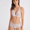 Le shorty offre à la mariée un confort sans pareil et une allure conjuguant romantisme et modernité. La broderie Cornely se déploie en deux motifs superposés, dans une transparence délicate et charmeuse. À l’arrière, une bande de guipure ajourée dévoile la nudité.