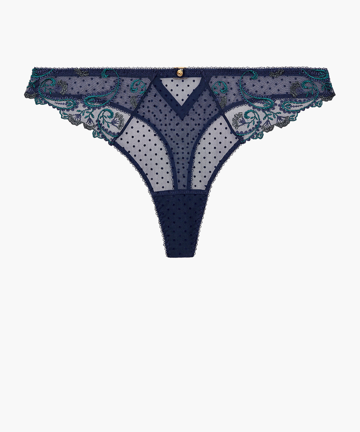 Idéal pour un effet discret sous les vêtements, même les plus près du corps, le tanga Velvet Memories mêle broderie française, tulle plumetis en velours, détails dorés et découpe dans le dos pour proposer un dessous original, élégant et léger, facile à porter en toute occasion.