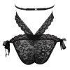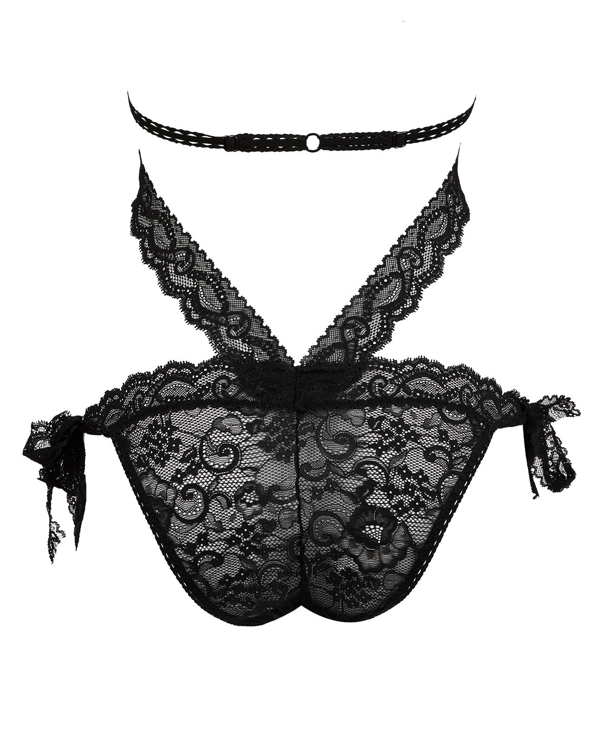 Modèle trikini très sexy se composant d’un soutien-gorge sans armature avec un agrafage simple à l’entre-seins, relié à la culotte par deux bandes de dentelle noire.