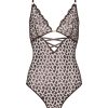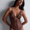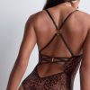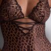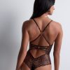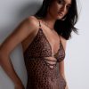 Habillant le buste d’une broderie animale audacieuse, le body Crazy in Love offre des jeux de transparence modernes. Résolument sexy, il se pare d’un décolleté profond souligné par des liens à l’esprit bondage subtil. Dans le dos, les bretelles se rejoignent en un anneau doré pour un effet graphique irrésistible.