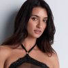 - Ensemble tout en transparence composé d’une culotte mini-coeur résolument sexy avec son ouverture dans le dos et d’un soutien-gorge brassière tour de cou très tendance