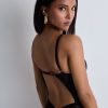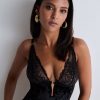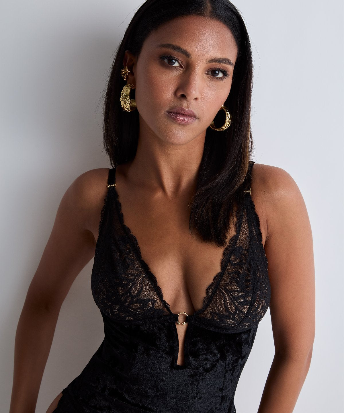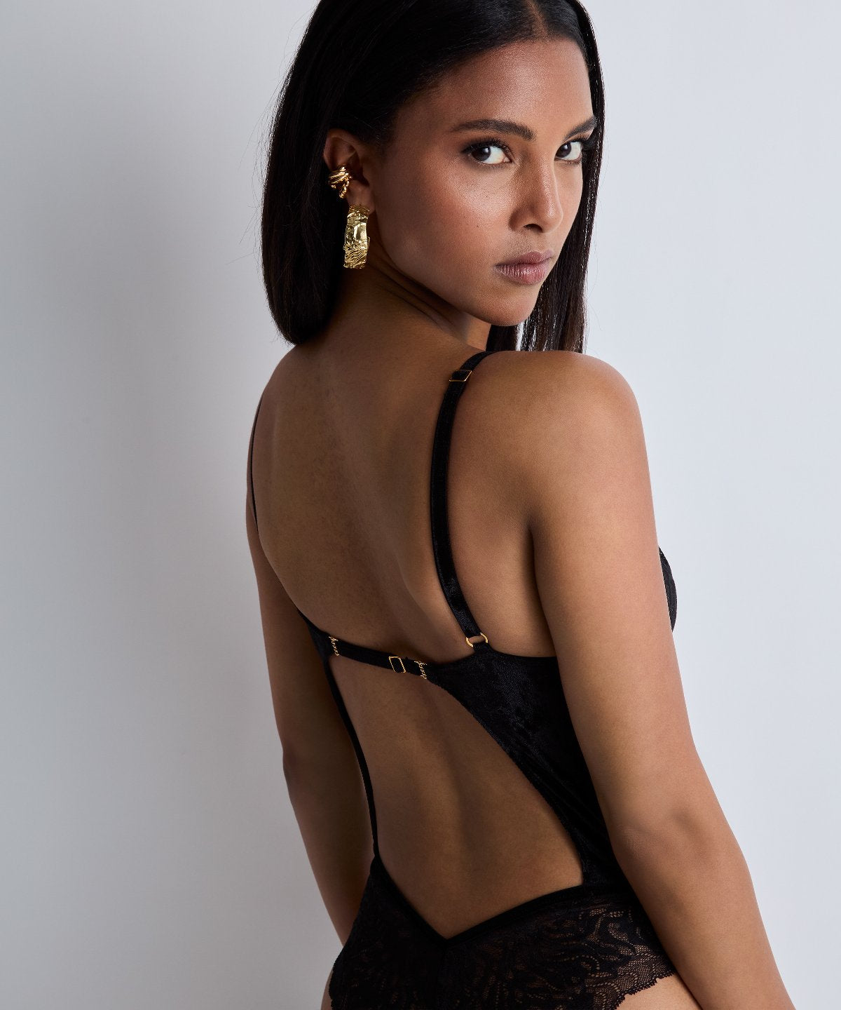 Pièce exclusive, le body The night before se pare, sur le décolleté, les hanches et le galbe des fesses, d’une dentelle sexy, mise en valeur par un empiècement en velours moiré inédit, façon corset. Tout en jeux de transparence, il présente, derrière, une découpe graphique originale pour une silhouette audacieuse.