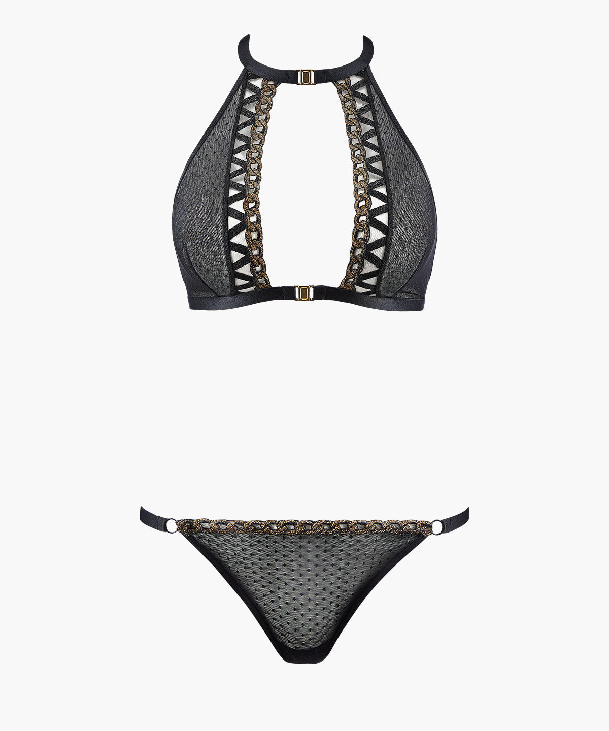Résolument sexy, l’ensemble Unchain me up se compose d’un soutien-gorge triangle bralette sans armatures offrant un décolleté profond et structuré et d’une culotte mini-cœur au boutonnage très suggestif. Offrant tous deux des formes légères et modernes, ils voilent et dévoilent la peau dans un esprit à l’érotisme à peine dissimulé.