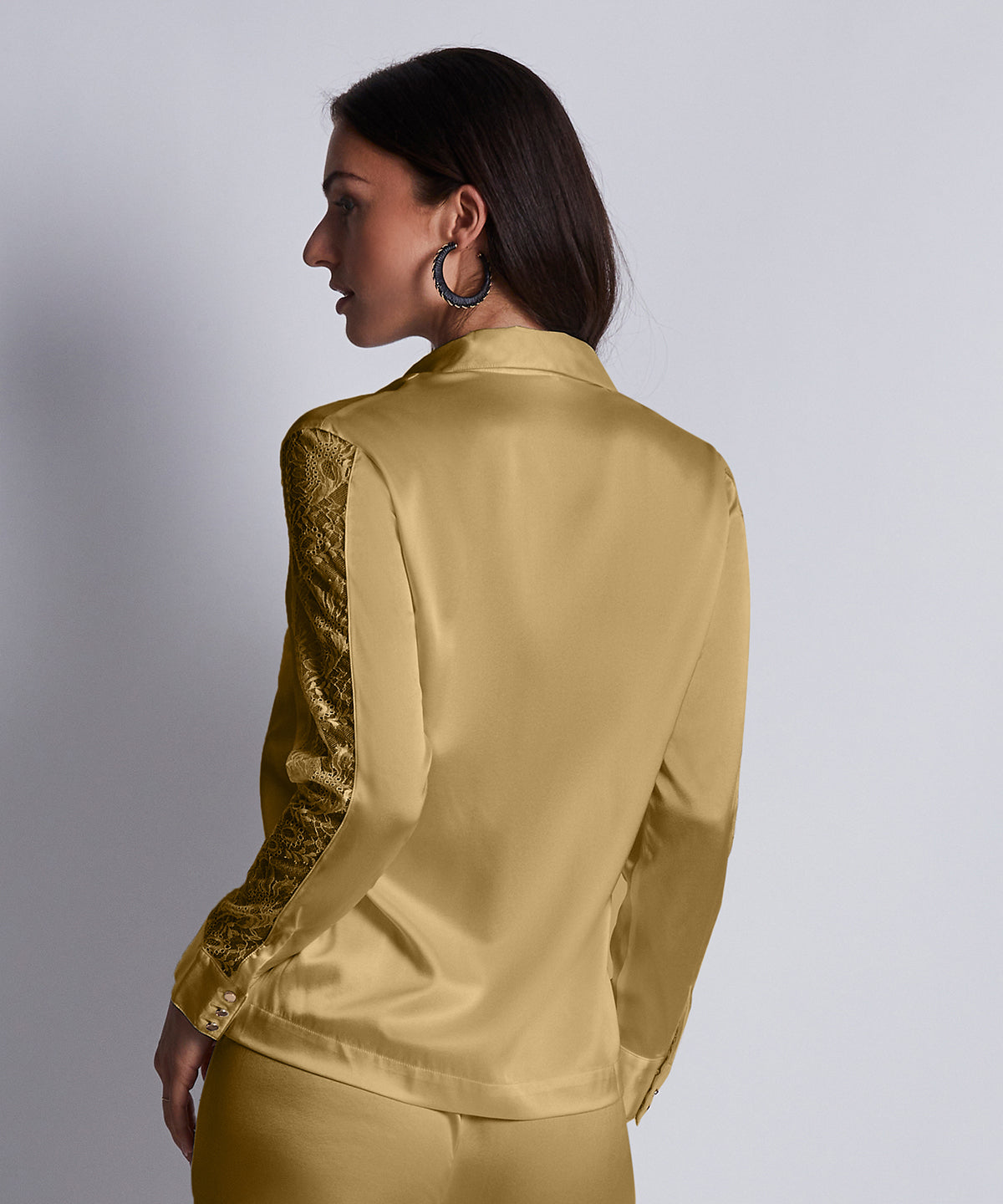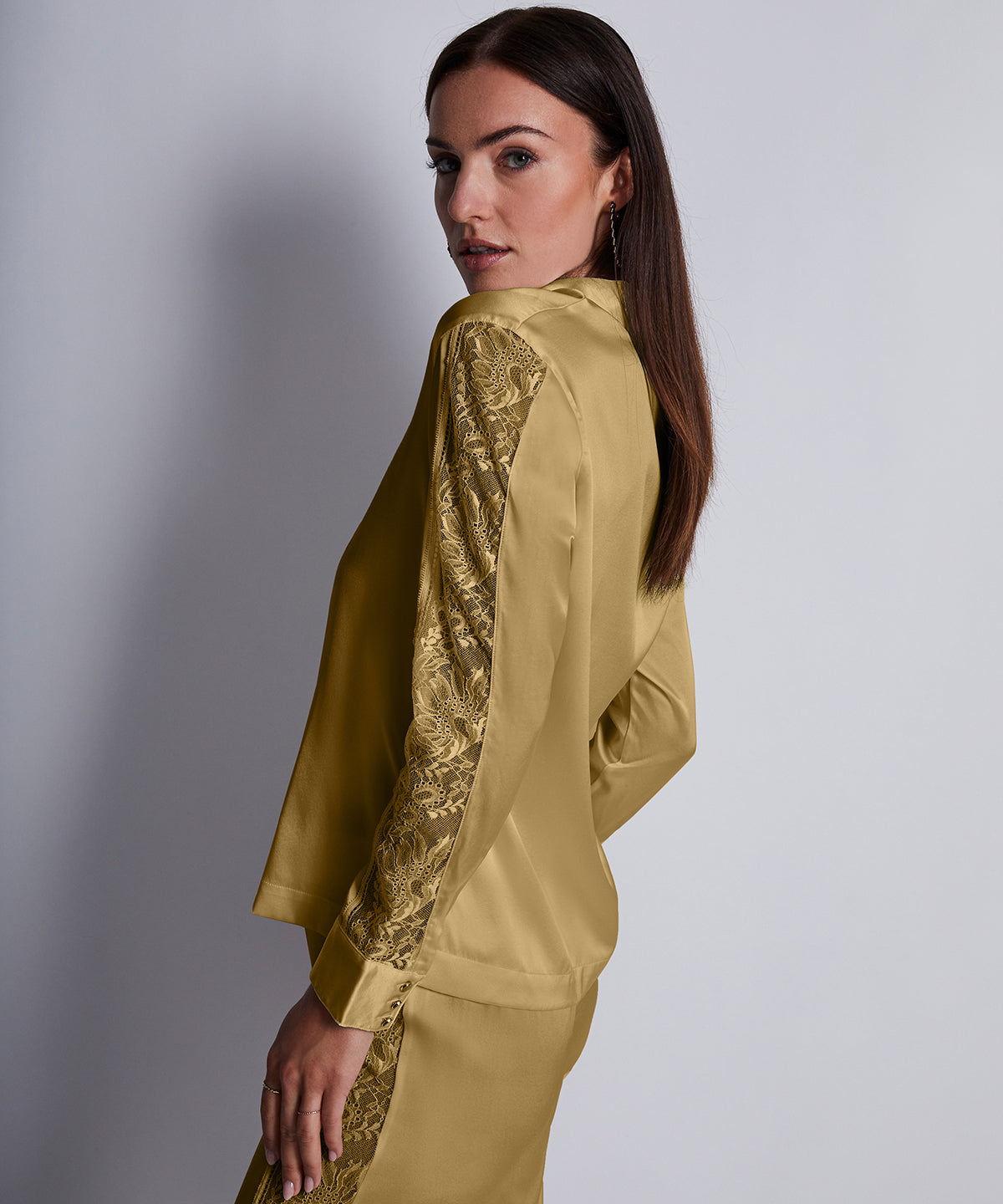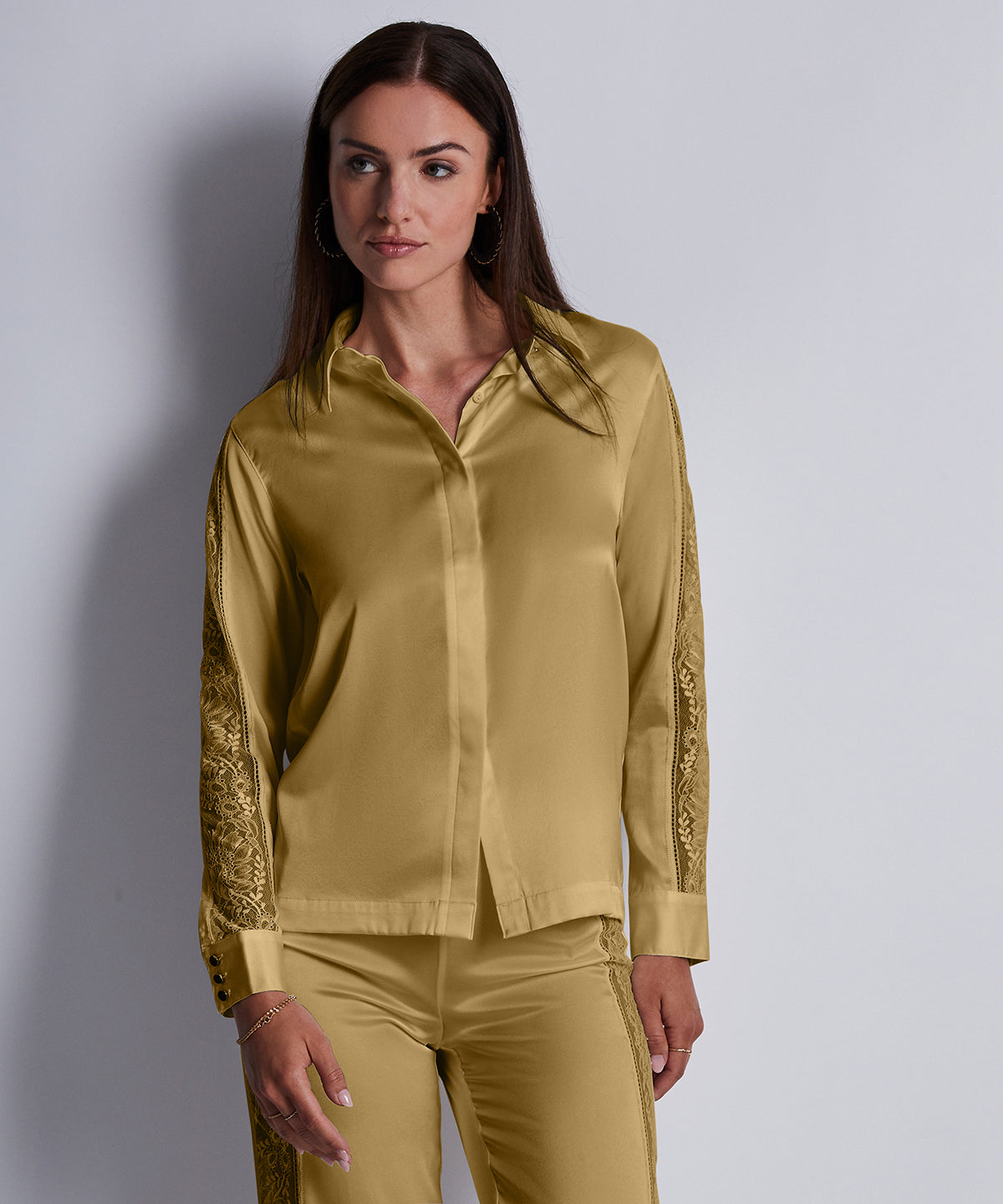 Conçu pour être porté de jour comme de nuit, le chemisier Midnight Whisper se prête à toutes les occasions. Entièrement en soie brillante et sensuelle, il se pare d’un élégant boutonnage rehaussé par un bouton doré sur le col. Sur les manches, des empiècements en dentelle sexy dévoilent la peau.