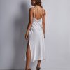 Sculpturale et sexy, la nuisette longue Midnight Whisper offre une forme moderne, tout en soie délicate, avec fentes sur les côtés. Devant, un empiècement en dentelle ajourée résolument séduisant souligne un décolleté en V très profond, rehaussé de petits boutons dorés, et se poursuit derrière, offrant un dos largement ouvert.