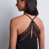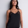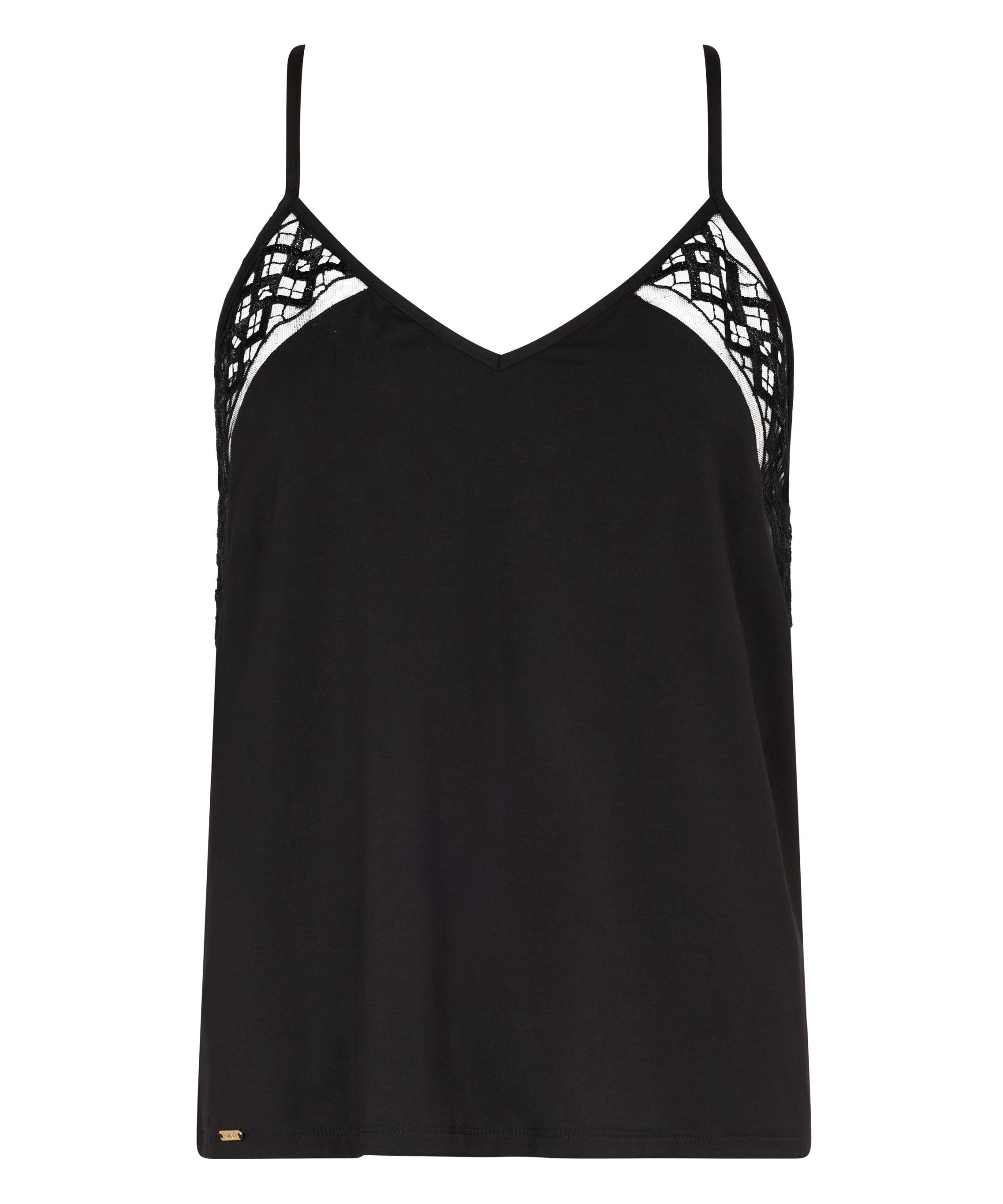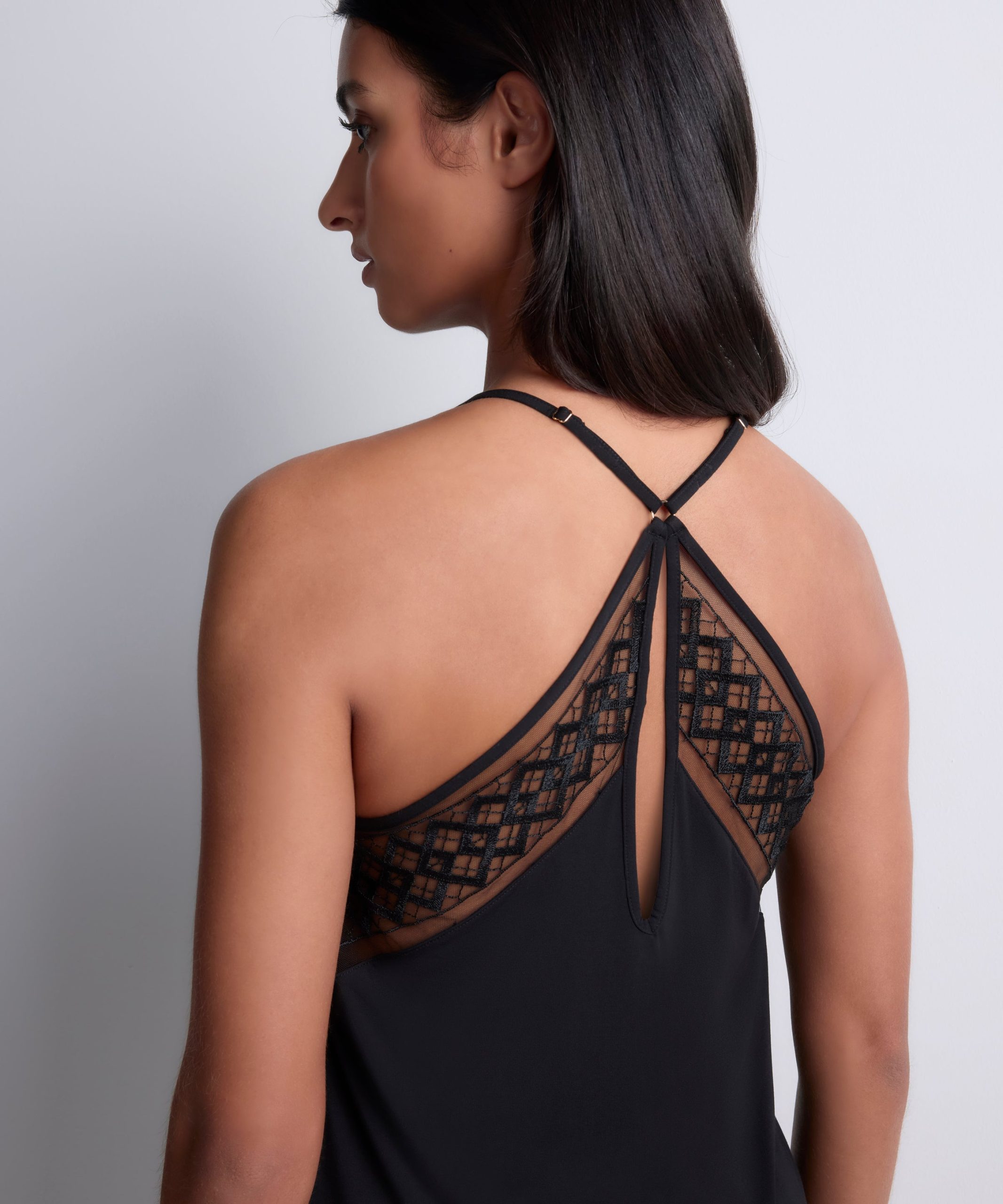 Fluide et léger, le top fines bretelles Sweet Obsession déploie une matière douce et confortable, rehaussée par des empiècements en broderie qui encadrent subtilement le décolleté dans des jeux de transparence très sensuels. Dans le dos, les bretelles se croisent pour offrir une forme goutte d’eau moderne et résolument sexy.