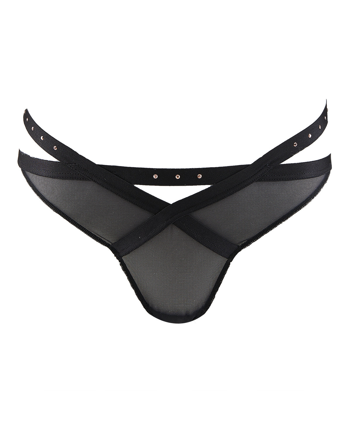 La ligne Rencontre Anonyme revisite la culotte mini-cœur dans un esprit coquin et malicieux : troublante à l’avant par ses jeux de transparence et de nudité, elle sangle les hanches pour emprisonner l’arrière de mille liens charmeurs. Le laçage s’efface à la naissance des fesses pour laisser libre cours à l’aventure sensuelle.