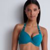 Avec sa forme push-up disponible jusqu’au bonnet E, le haut de maillot de bain plunge coque Secret Laguna offre un décolleté sexy, encadré par un triple départ des bretelles serti de perles martelées. Assurant confort et maintien, il se noue derrière le cou et présente une attache très élégante derrière.