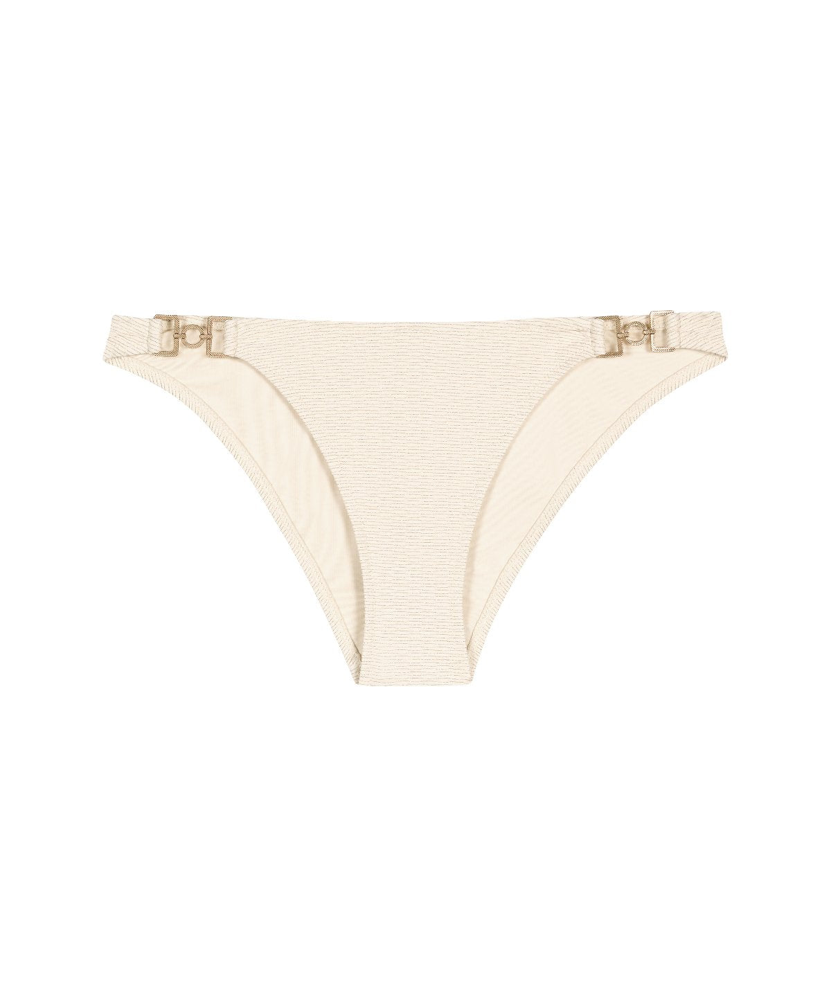 Sexy, le bas de maillot de bain mini-cœur Shimmering Waters offre une forme culotte confortable, étroite sur les côtés et légèrement échancrée dans le dos. Élégante, elle se pare de touches dorées sur les hanches, en écho au fil lurex qui magnifie la matière, pour une silhouette tout en sensualité.