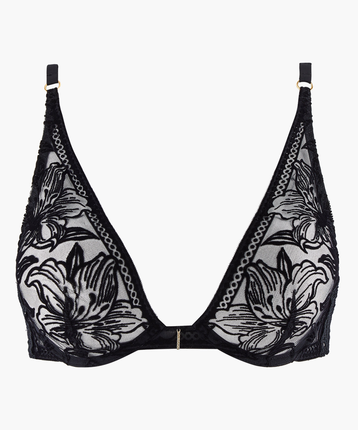 Avec sa matière remontant haut sur le buste, le soutien-gorge triangle ultra plunge Cœur à Corps dessine joliment le galbe de la poitrine dans un décolleté sexy. Alliant la sensualité de son motif floral à la modernité de sa guipure graphique, il joue avec les codes de la séduction.