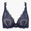 Tout en jeux de transparence, le soutien-gorge triangle plunge Danse des Sens déploie sa dentelle florale jusqu’aux épaules pour un décolleté sexy, dont la profondeur est accentuée par un nœud satiné à l’entregorge. Confortable mais séduisant, il présente un agrafage arrondi qui confère à l’ensemble une touche de modernité indéniable.