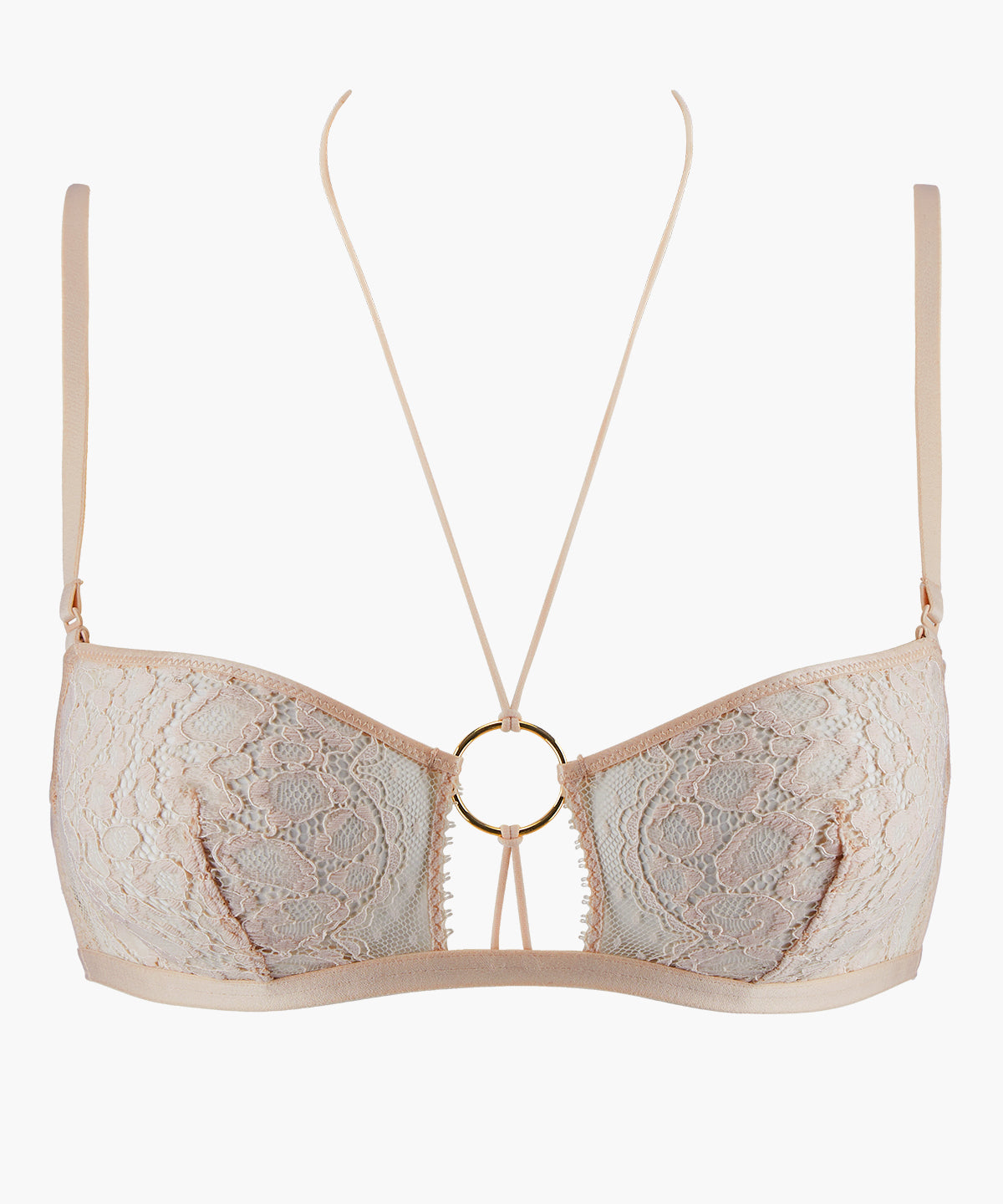 - Une brassière souple tendance avec un tour de cou noué autour d’un anneau doré