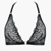 Léger et mode, le soutien-gorge triangle L’Indomptable, sans armatures, offre un décolleté profond, structuré par une broderie graphique exclusive et par des anneaux dorés à l’entregorge et sur les bretelles. Dans le dos, il se pare d’un jeu sculptural de bandes croisées esprit bondage pour un effet résolument hypnotique.