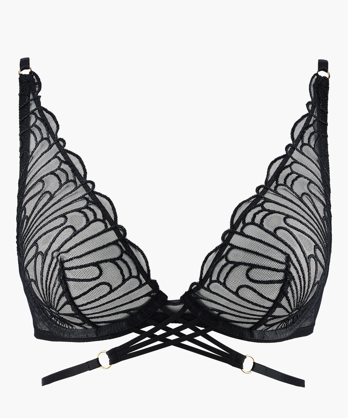 Dessinant sur la peau les motifs graphiques de sa broderie pour un effet très sexy, le soutien-gorge triangle ultra plunge L’Indomptable offre un décolleté profond et sensuel. Inspiré des codes du bondage, un jeu de liens croisés pare le dessous de la poitrine en écho aux triples bretelles du dos.