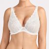 Le décolleté profond et sexy offre sa séduction aux poitrines les plus généreuses. Jusqu’au bonnet F, le soutien-gorge Triangle Plunge Confort déploie sa féminité dans le romantisme de la broderie Cornely. De riches bretelles doublées d’une guipure coordonnée encadrent la poitrine.