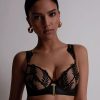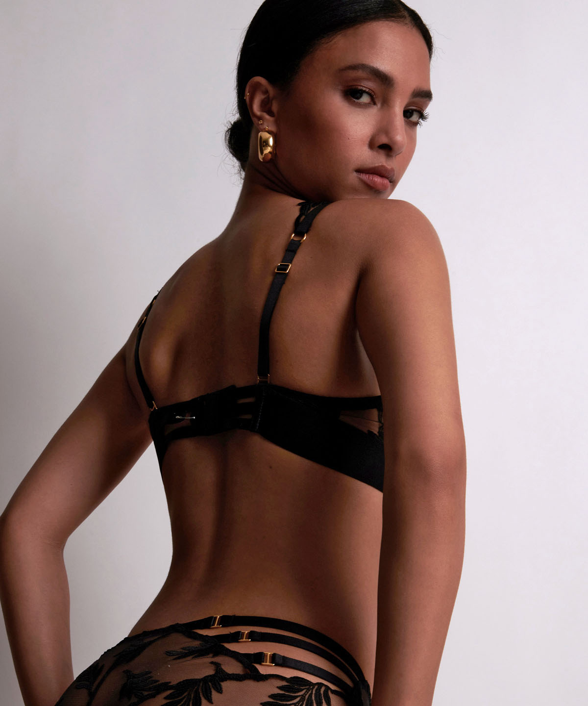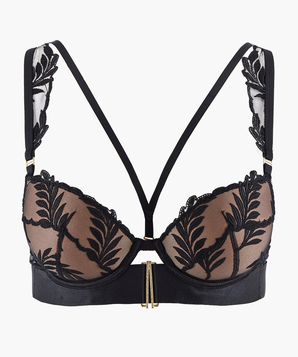 Offrant un confort optimal avec ses coques intégrées, le soutien-gorge plunge coque Queen of Shadow dessine un décolleté profond et sexy jusqu’au bonnet E. Tour du cou amovible, bretelles habillées de broderie, bijou à l’entregorge, bandes graphiques dans le dos… Tout est pensé pour offrir un effet sensuel et irrésistible.
