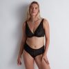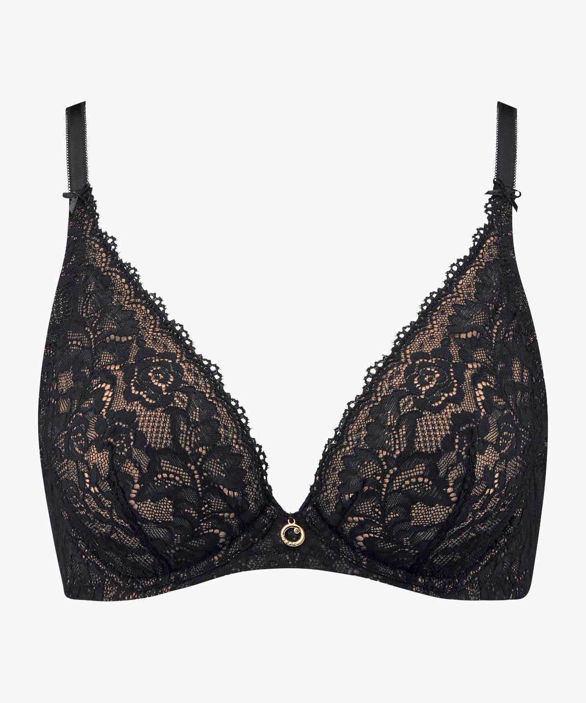 Résolument moderne, le soutien-gorge triangle armatures Rosessencehabille de sa dentelle florale raffinée tout le décolleté, lui conférant une profondeur très sexy accentuée par un bijou à l’entregorge. Disponible jusqu’au bonnet G, il offre un dos travaillé en « tour Eiffel » qui assure confort et maintien au quotidien.