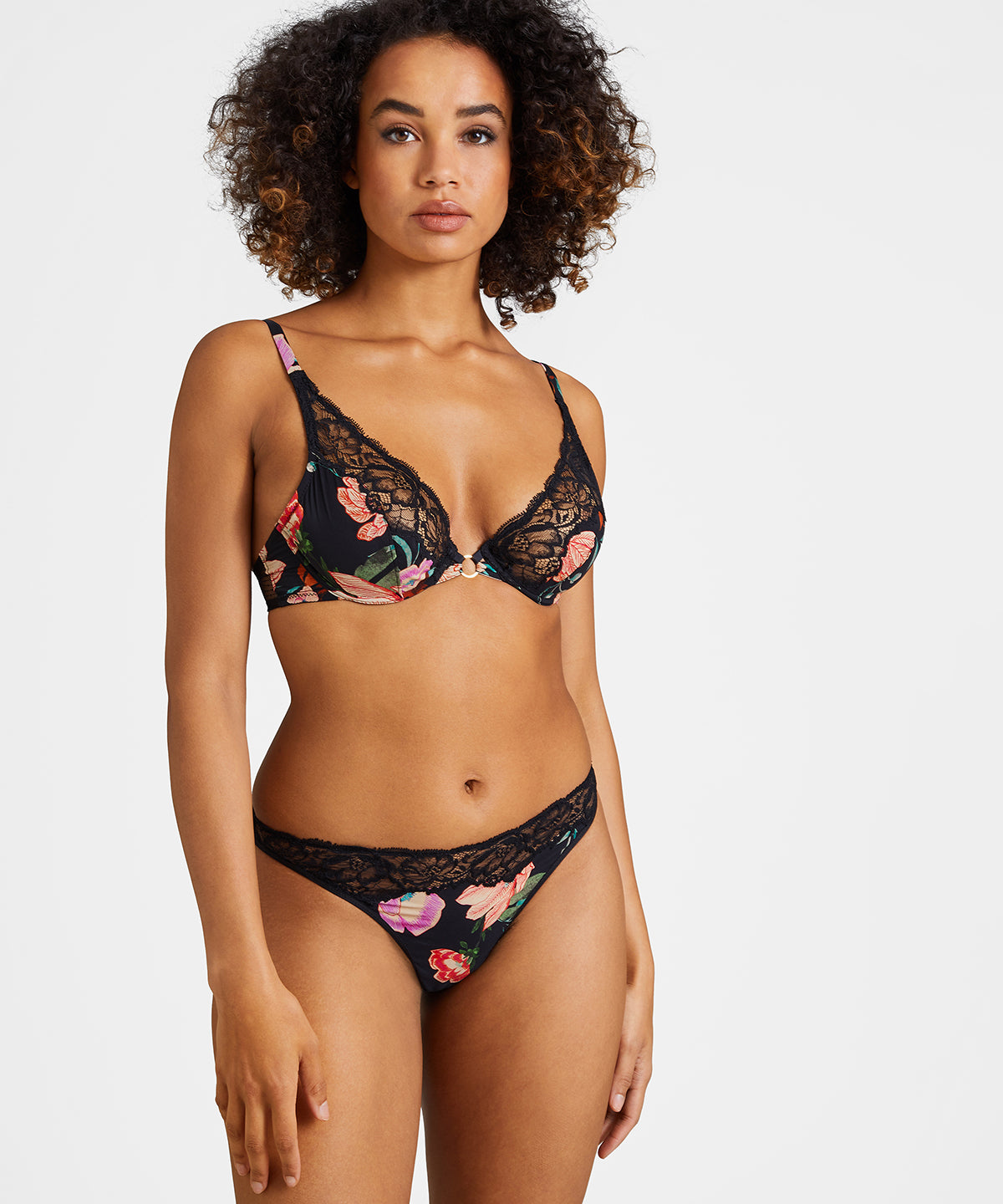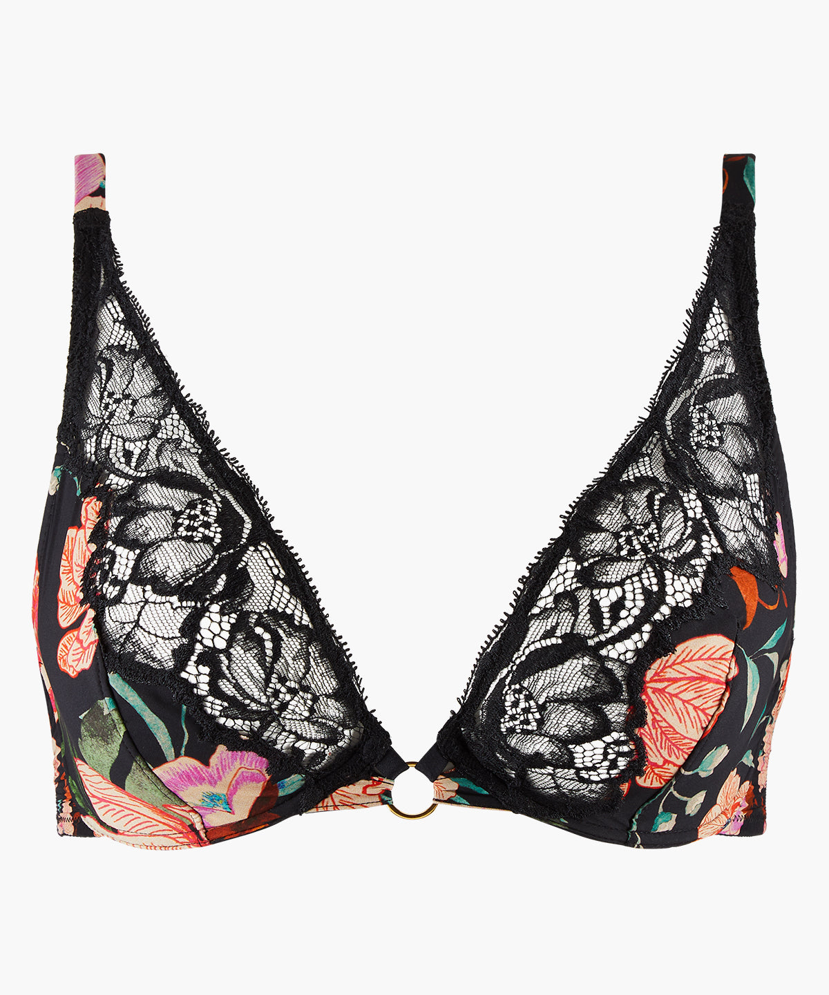 Offrant un décolleté plongeant très sexy au maintien et au confort parfaits, le soutien-gorge triangle avec armatures Sweet Folk déploie avec délicatesse sur la poitrine une dentelle incrustée raffinée, un imprimé floral exclusif en maille Lycra® légère et un anneau doré éclatant à l’entregorge pour incarner une féminité qui s’exprime en toute liberté.