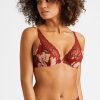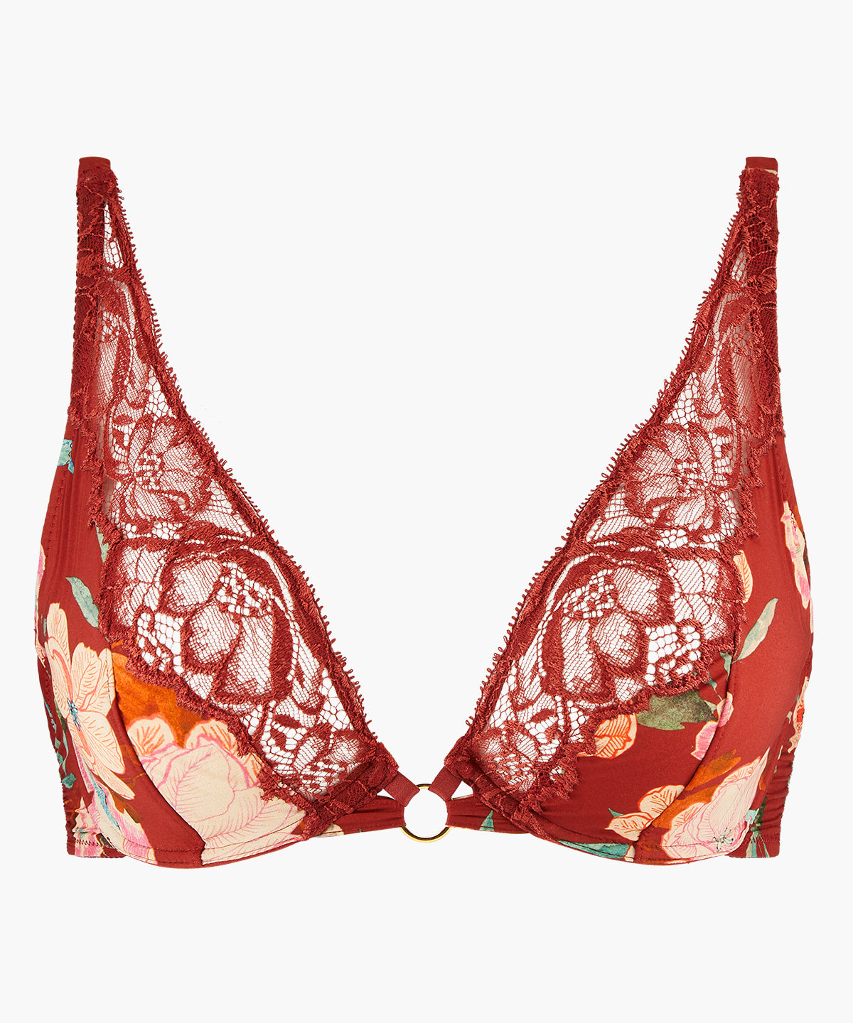 Offrant un décolleté plongeant très sexy au maintien et au confort parfaits, le soutien-gorge triangle avec armatures Sweet Folk déploie avec délicatesse sur la poitrine une dentelle incrustée raffinée, un imprimé floral exclusif en maille Lycra® légère et un anneau doré éclatant à l’entregorge pour incarner une féminité qui s’exprime en toute liberté.