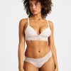 Le soutien-gorge triangle coque Sweetessence est sans armatures. Il se décline jusqu’à la taille L, avec des coques en maille polyamide recyclée doublées d’une finition délicate pour un porté agréable. Le bas du modèle et les bretelles sont décorés de dentelles et l’entregorge se pare d’un joli bijou doré.