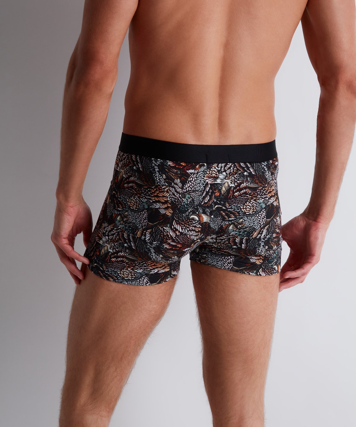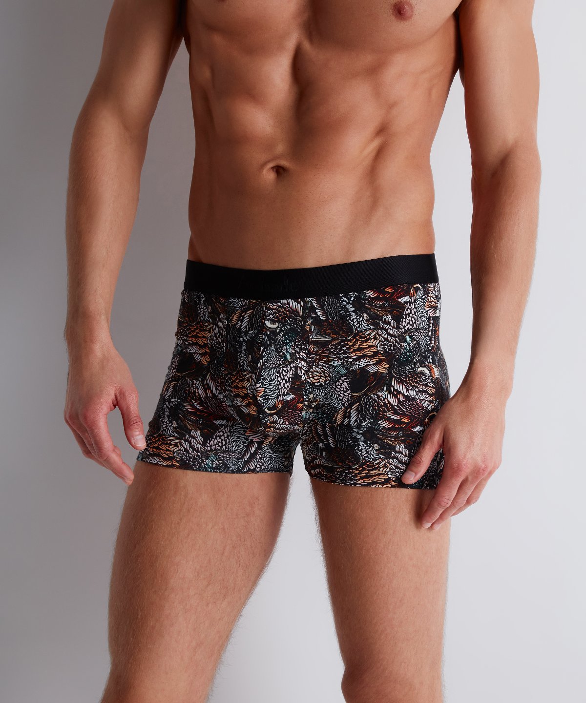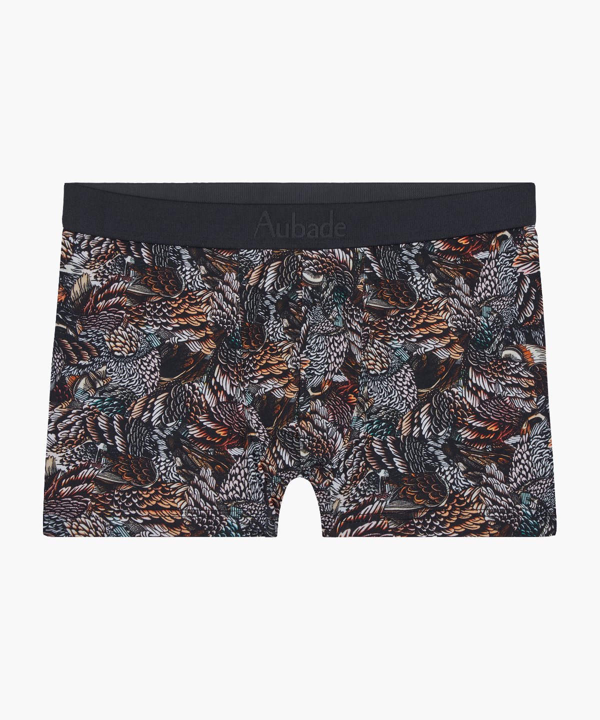 Graphique et hypnotique, le boxer Owls se pare d’un motif très original de plumage aux coloris mystérieux dans une coupe sexy et moderne, tout en coton modal extensible. Alliant confort et séduction, il comprend un renfort à l’entrejambe pour un maintien optimal, ainsi qu’une ceinture logotypée Aubade ton sur ton.