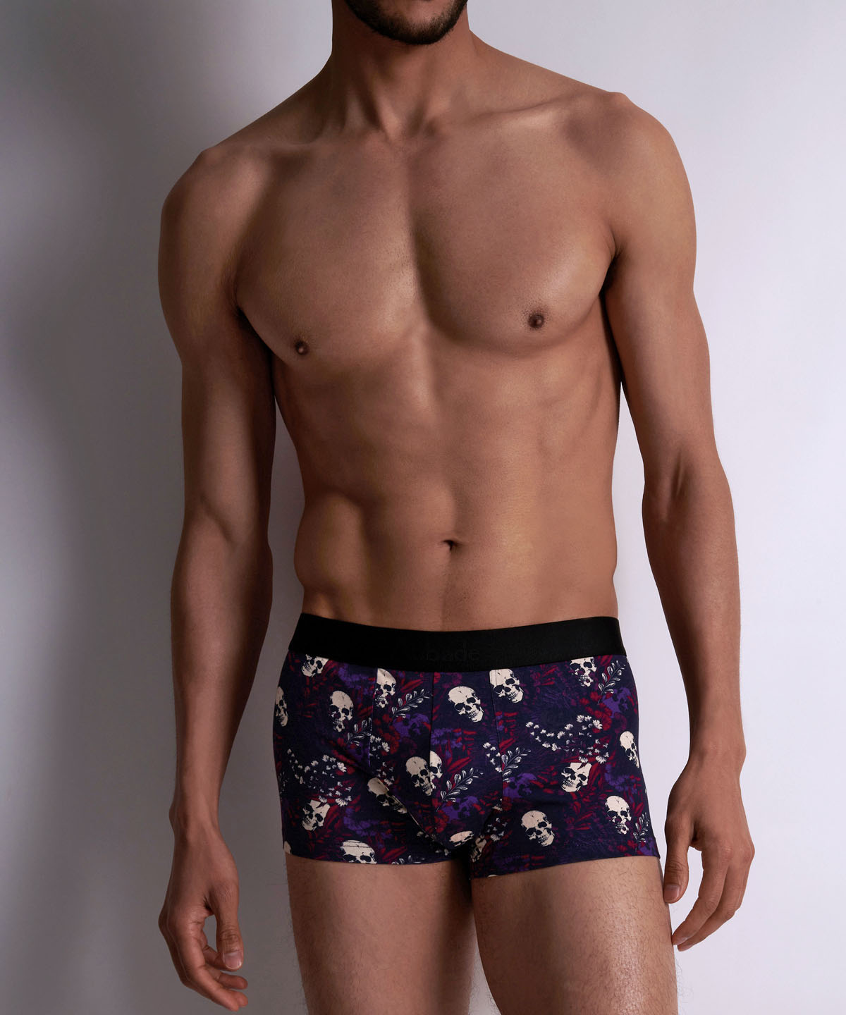 Très tendance dans ses coloris comme dans ses motifs têtes de mort associées à des fleurs que l’on imagine volontiers vénéneuses, le trunk Flower Skull est un sous-vêtement moderne et original. Il assure un confort absolu au quotidien avec son renforcement à l’entrejambe et sa ceinture élastique à la taille.